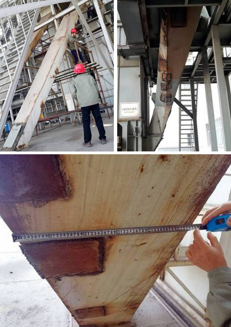 如圖所示,這個下料溜槽磨損嚴(yán)重,以前采用的8mm厚的普通鋼板,不到1年就磨穿了。高度近7米,斜面長近9米,落差高,顆粒大,爐渣內(nèi)有10mm左右的大顆粒,因為原煤里有煤矸石沒有被完全燃燒,所以造成溜槽底側(cè)嚴(yán)重漏粉,經(jīng)常被磨穿。了解到這些情況后,湖南精城特種陶瓷有限公司的技術(shù)專家結(jié)合現(xiàn)場的工況,給出了解決方案,整體分段制作溜槽,在每段流槽的磨損面粘貼精城牌大塊厚瓷(NMC-G耐磨陶瓷),各段之間采用法蘭連接,此方案經(jīng)濟又環(huán)保,使用壽命在6年以上。