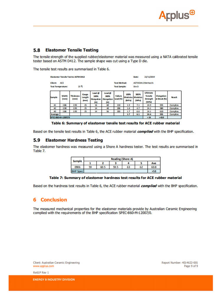 應(yīng)澳大利亞必和必拓鐵礦公司要求,澳大利亞國際測試機(jī)構(gòu)協(xié)會(huì)對(duì)湖南精城特種陶瓷有限公司生產(chǎn)的橡膠拉伸強(qiáng)度和硬度進(jìn)形測試,該測試基于ASTM D412標(biāo)準(zhǔn)。經(jīng)測試,精城特瓷的橡膠性能完全符合甚至超過必和必拓鐵礦公司對(duì)耐磨陶瓷襯板的橡膠要求標(biāo)準(zhǔn)。