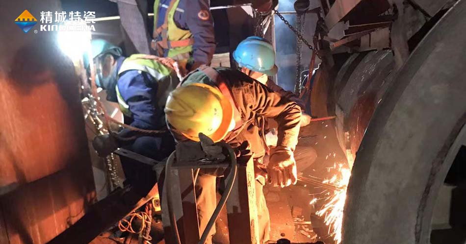 到達(dá)現(xiàn)場(chǎng)之后,精城工作人員并沒有盲目動(dòng)手,而是先分析陶瓷脫落的原因,力爭(zhēng)從根本上解決問題。經(jīng)過分析發(fā)現(xiàn),鋼廠的圓輥布料器所處的工作環(huán)境極其復(fù)雜,工作過程中時(shí)常伴隨著物料的強(qiáng)烈沖擊和摩擦,摩擦產(chǎn)生的高溫會(huì)使固定陶瓷的粘膠粘性下降,而強(qiáng)大的沖擊力也容易引起陶瓷松動(dòng),這兩者共同作用就導(dǎo)致了圓輥布料器出現(xiàn)陶瓷脫落現(xiàn)象。
