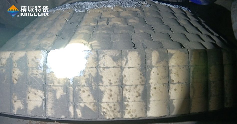 燕尾陶瓷是在磨損位置安裝鋼鐵導軌,利用導軌和燕尾陶瓷的機械自鎖力固定陶瓷,配合精城特制的高溫陶瓷粘膠形成雙重固定,有效的解決了立磨中的高溫問題。在此基礎上,精城根據不用的磨損、沖擊強度,在不同的部位使用不同的耐磨陶瓷,在保證陶瓷防磨能力的情況下為客戶節省成本。強沖擊點使用ZTA陶瓷,其他地方使用精細氧化鋁陶瓷,在保護套邊緣等陶瓷易脫落的位置做了檔條,配合圓弧形陶瓷保證陶瓷固定牢固不脫落。