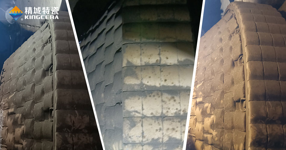 兩年前,精城受邀前往該水泥廠幫客戶解決水泥立磨磨輥軸保護套磨損難題??蛻舻牧⒛ナ巧夏ィ笮〔灰坏氖瘔K、砂礫、黏土等,石塊棱角尖銳,會造成切削磨損,黏土會造成疲勞磨損,磨損情況復雜,還伴隨著強沖擊以及300℃的高溫。之前客戶使用的是鋼板加金屬堆焊保護套,但使用半年就會被磨穿損壞,需要檢修更換。精城分析研究了客戶的工況之后,為他們安裝了燕尾陶瓷磨輥軸保護套。